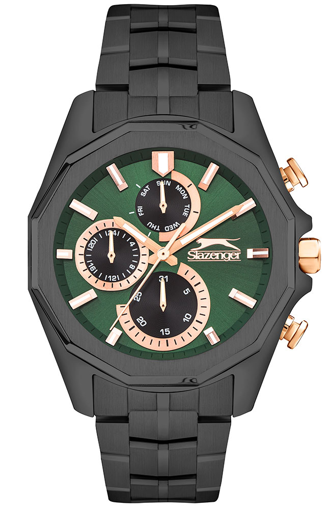 ساعت اسلازنجر مردانه مدل SL.9.2312.2.05 با موتور کوارتز فول دیت با قاب و بند فول مشکی و صفحه سبز مناسب اسپرت پوشان