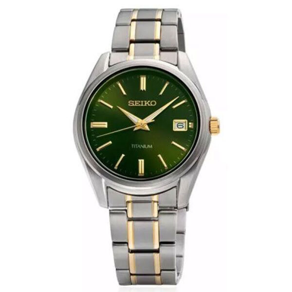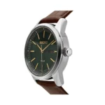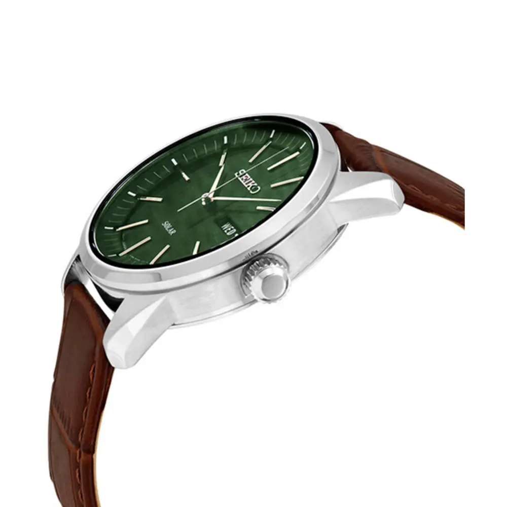 ساعت سیکو مردانه مدل SNE529P1 با موتور کوارتز سولار بدون نیاز به باطری با صفحه سبز و بند چرم قهوه ای مناسب تیپ های رسمی و نیمه رسمی