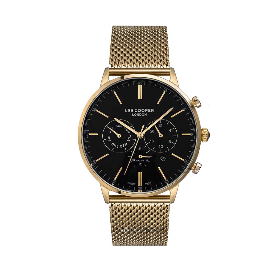 ساعت لی کوپر مدلLC07199.150 با موتور دو زمانه کوارتز و رنگ بدنه تمام طلایی و صفحه ی مشکی دارای نشان دهنده تقویم و ایام هفته.
