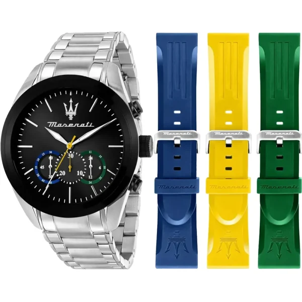مازراتی لیمیتد مردانه مدل R8873612061 به همراه سه عدد بند رابر با رنگ های زرد و سبز و آبی و آچار تعویض بند که به راحتی میتونین بند ساعت رو تعویض کنین.