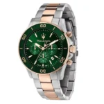 ساعت مازراتی مردانه مدل R8873600004 با موتور کوارتز کرنوگراف و دور قاب تاچیمتر سرامیک و صفحه سبز مناسب خاص پوشان