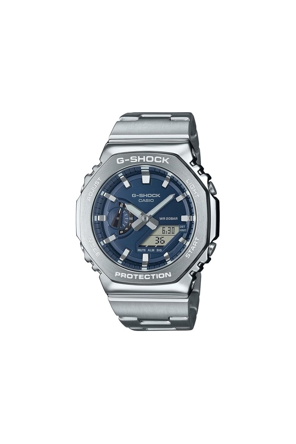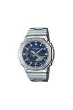 این مدل با الهام از طراحی نمادین GA-2100 (Casioak)، اما با ارتقاء چشمگیر در متریال، ساخته شده است. قاب آبی نفتی (Blue) بسیار خاص است و در ترکیب با بند رزین مشکی، تضاد زیبایی ایجاد میکند. جزئیات فلزی روی بند و قاب، حس یک ساعت مکانیکی فاخر را القا میکند، در حالی که همچنان مقاومتهای استاندارد G‑Shock را حفظ کرده است.