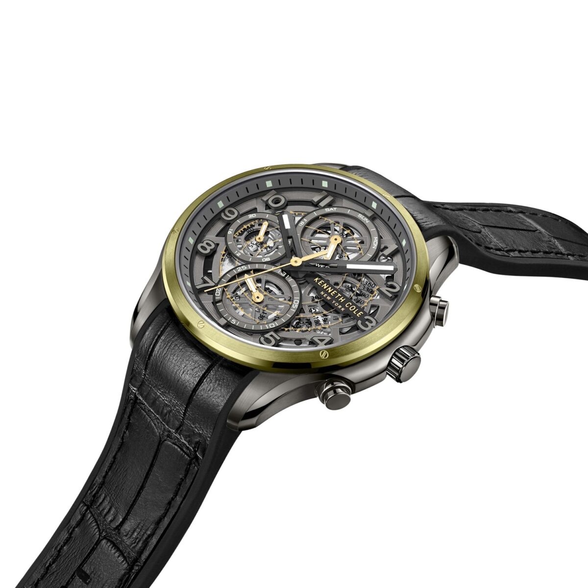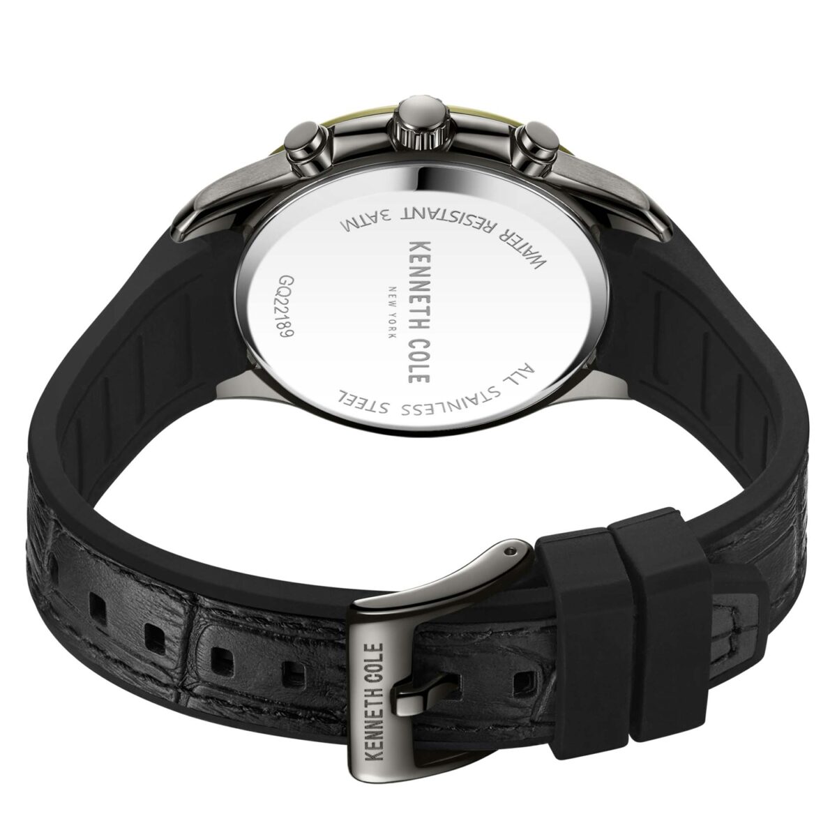 کنت کول مردانه مدل KCWGQ2218901 با اصاللت برند آمریکایی طراحی خاص,بند رابر با روکش چرم و رنگ سبز دور قاب کار شده.
