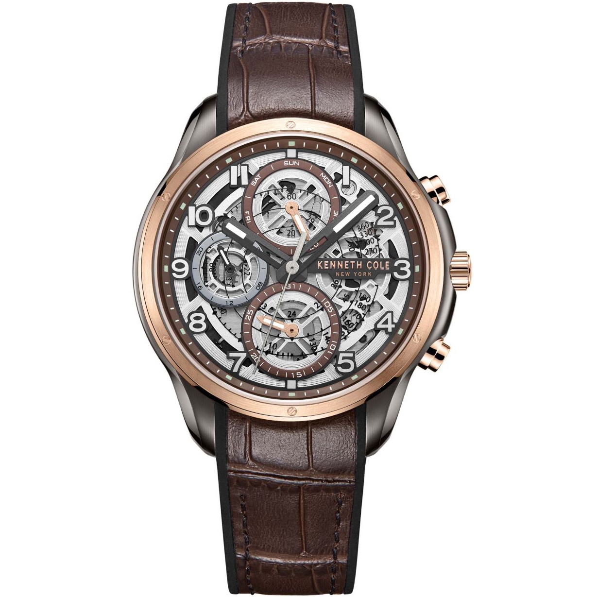 کنت کول مردانه مدل KCWGQ2218902 با اصاللت برند آمریکایی طراحی خاص,بند رابر با روکش چرم و رنگ قهوه ای دور قاب رزگلد کار شده.